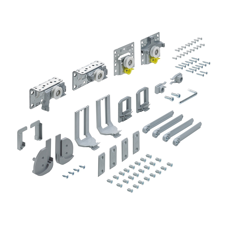 TopLine L, pro sériovou výrobu, sada vozíků a vodicích dílů, bez výškového seřízení, přední vpravo. Sada obsahuje horní nosné vozíky, dolní vodicí díly a spojovací materiál. Pro skříň se 4 dveřmi objednejte sadu na 2 dveře s levými předními dveřmi a sadu s pravými předními dveřmi