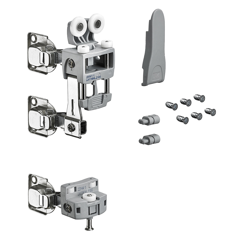 Sada obsahuje jeden nosný vozík, jeden vodicí díl a spojovací materiál pro jedny skládané dveře se 2 křídly, bez skládacích závěsů. Nutno doobjednat skládací závěsy, vodící profily, závěsy pro uchycení ke stěně a otvírací mechanismus viz. související sortiment.