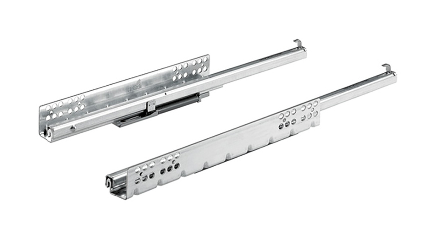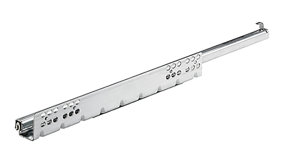 Částečný výsuv Quadro 25 s integrovaným tlumením Silent System pro tloušťku boků zásuvky až 19mm. Montáž nasunutím se spojkami a seřízením výšky bez použití nářadí. Nosnost 25kg; vestavná šířka EB23; minimální hloubka korpusu 563mm.