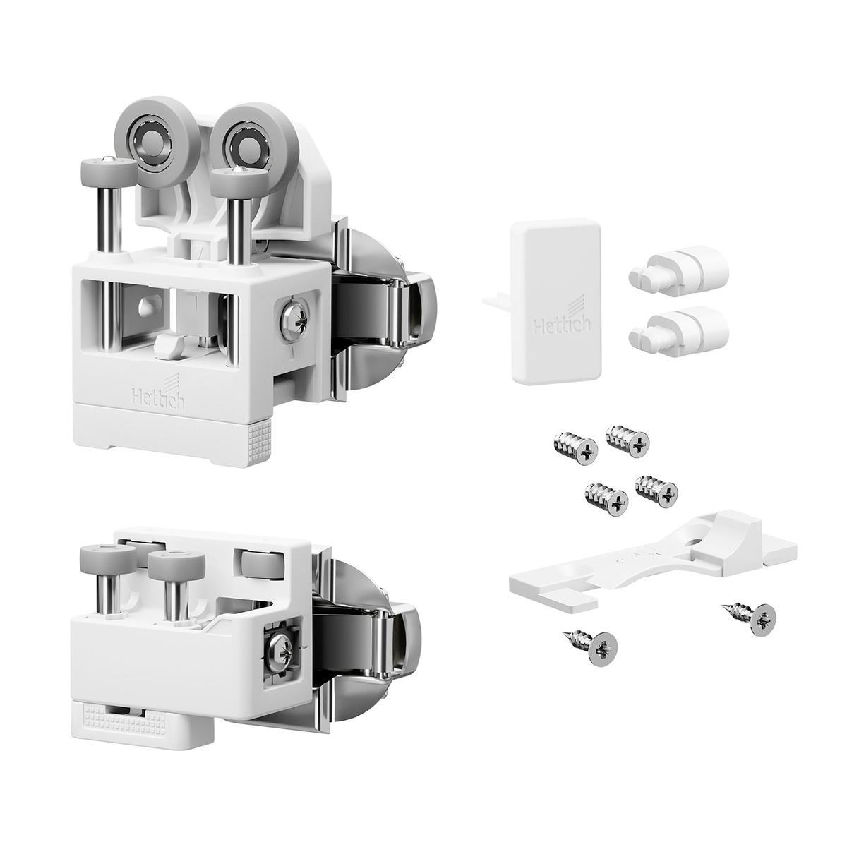 Sada kování pro středně těžké dveře s dolním vedením, 12 kg, bílá, pravá, se zavírací pružinou. Sada obsahuje díly pro dveře se 2 křídly: vozík s jedním závěsem, vodicí díl, krytku a spojovací materiál.