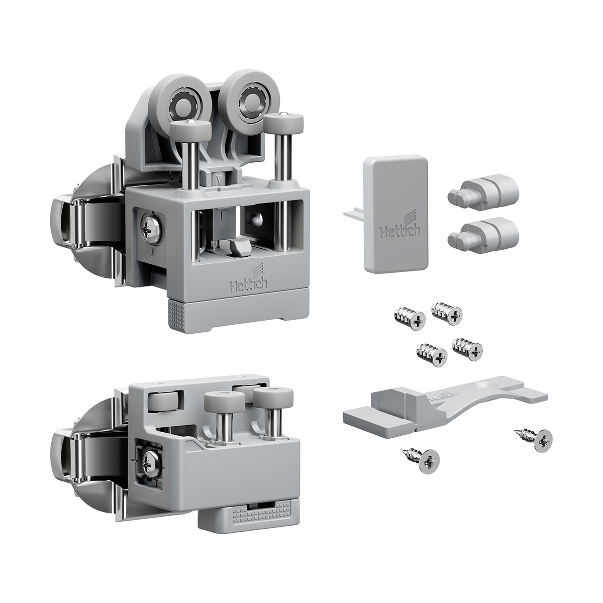 Sada kování pro středně těžké dveře s dolním vedením, 12 kg, šedá, levá, se zavírací pružinou. Sada obsahuje díly pro dveře se 2 křídly: vozík s jedním závěsem, vodicí díl, krytku a spojovací materiál.