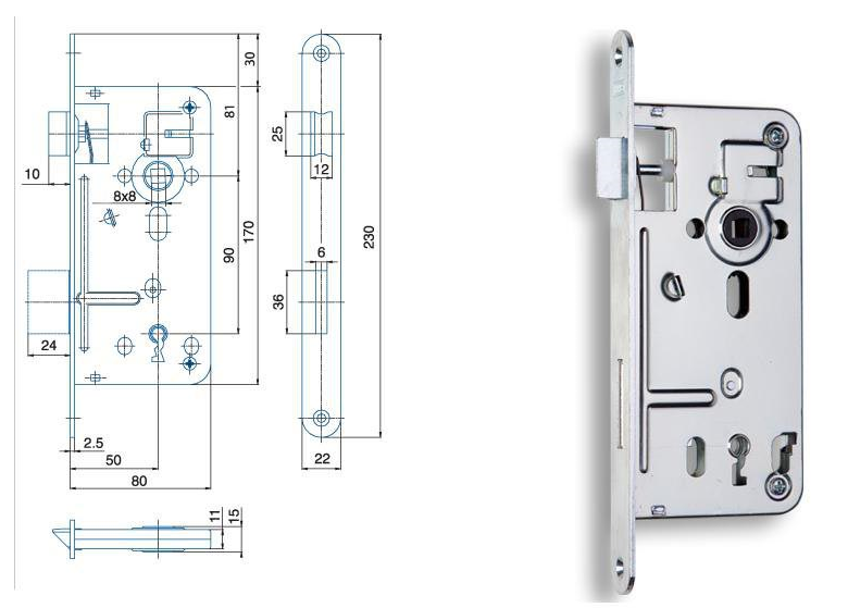 Stavební zadlabávací zámek Hobes 536 C pro běžný, dózický klíč (BB) o hloubce 80mm, osové vzálenosti 50mm, rozteči 90mm. Povrchová úprava zinek bílý. Dvouzápadový, s otvory pro dělené štíty, bez převodu. Včetně 1 klíče. Rozmer čela 230*20mm