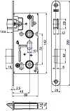 Stavební zadlabávací zámek Hobes K 105 pro cylindrickou vložku o hloubce 60mm, osové vzálenosti 40mm, rozteči 72mm. Povrchová úprava zinek žlutý. Jednozápadový, s otvory pro dělené štíty, bez převodu. Rozměr čela 200*20mm