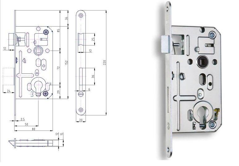 Stavební zadlabávací zámek Hobes K133 pro FAB klíč (PZ) o hloubce 80mm, osové vzálenosti 80mm, rozteči 72mm. Povrchová úprava zinek bílý. Dvouzápadový, s převodem, s otvory pro dělené štíty, Rozměr čela 220*20mm.