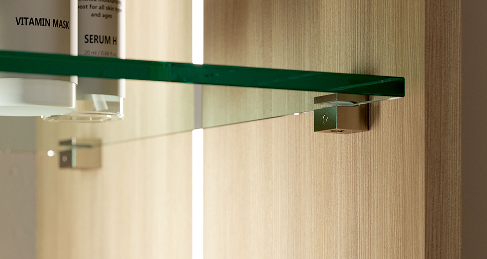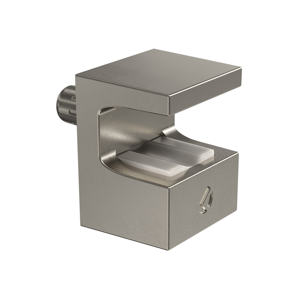 Elegantní policová podpěra pro skleněné police 5-6mm. Jednoduchá montáž i demontáž. Plast+nikl.