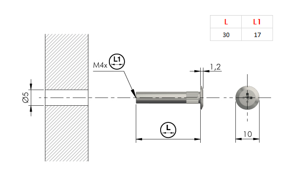 Spojovací matice M4 s ozdobnou hlavou. Otvor 5 mm. Povrchová úprava nikl. Protikus šroub kód 347716.