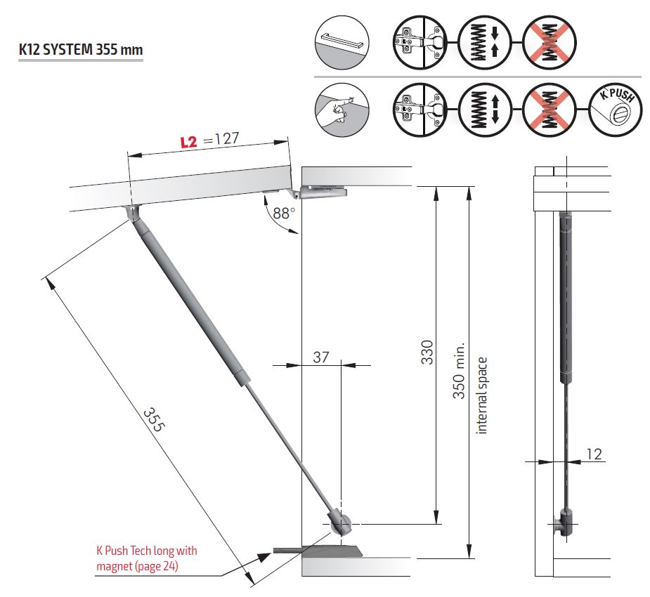 IF plynová vzpěra K12, pro horní výklop, automatická, 355mm/90N