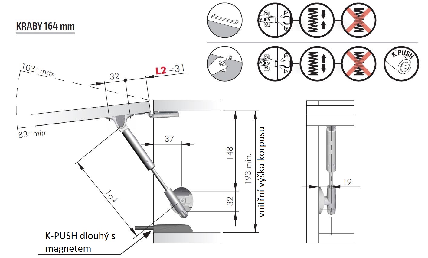 IF plynová vzpěra Kraby, pro horní výklop, polohovací, 164mm/60N
