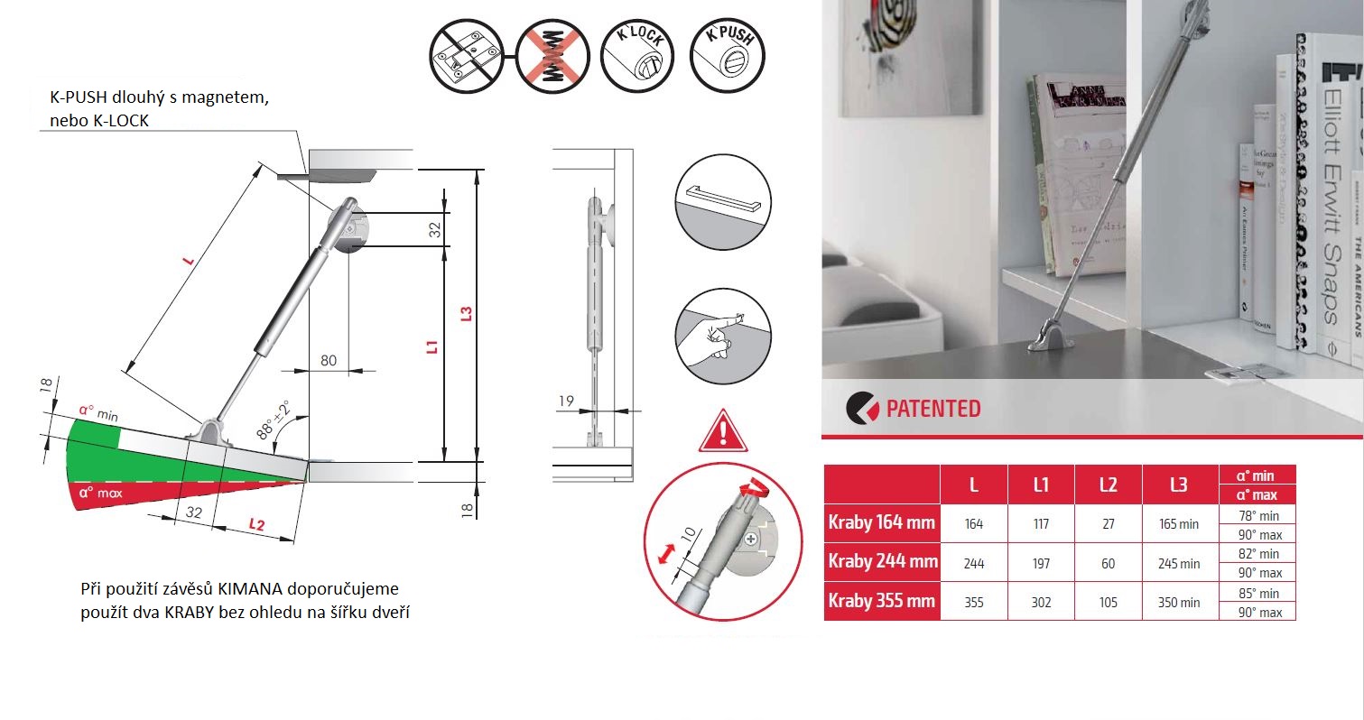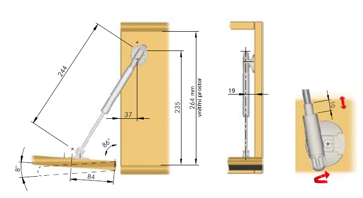 Plynokapalinový píst pro spodní vyklápění dvířek. Součástí balení jsou úchyty na korpus a dveře. V případě použití tenkého alu rámečku také adaptér 15597 + samořezný vrut 15598 2x a 15599 - 1x.