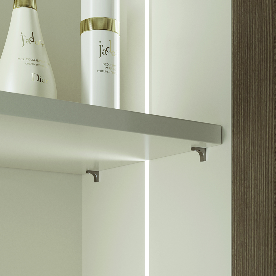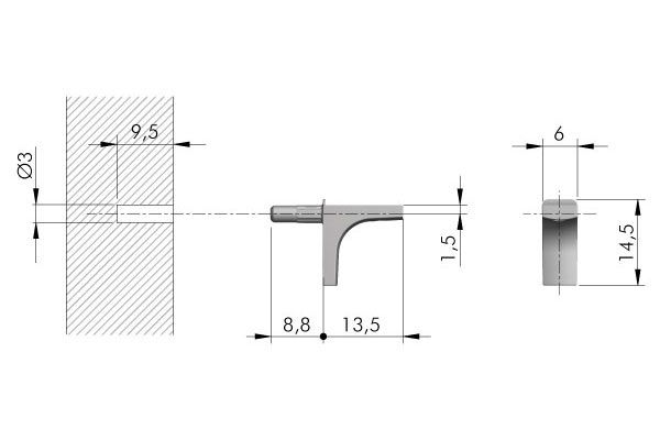 Elegantní policová podpěra pro dřevěné police. Pro otvor prům. 3 mm. Splňuje evropskou normu EN 14749/05.