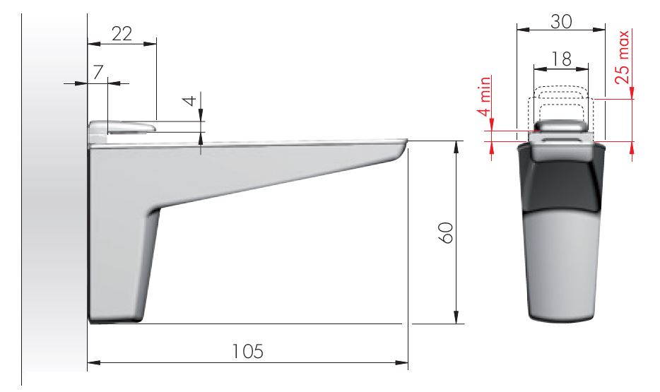 Chytrý výrobek: Jedna podpěra - mnoho řešení. Podpěra použitelná pro tloušťky polic 15 - 50 mm. V případě varianty pro skleněné police pak 4 - 25 mm. Nosnost 50 kg!