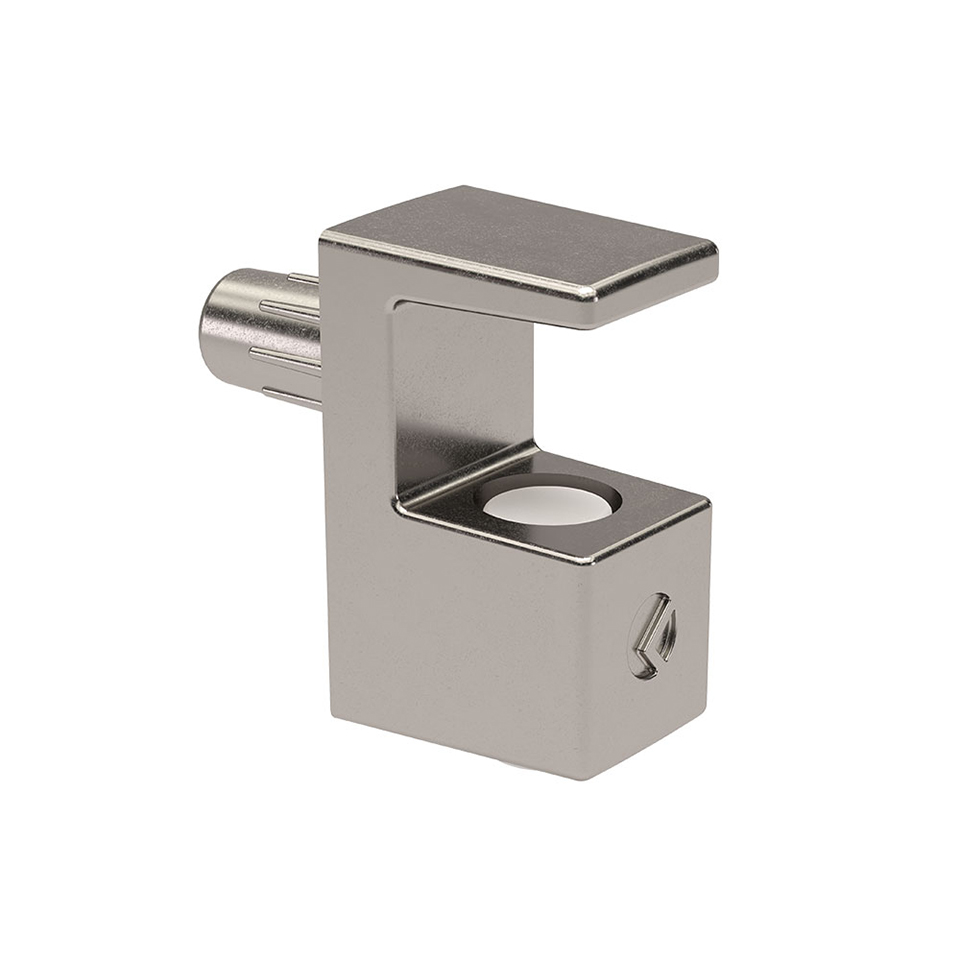 Elegantní policová podpěra pro skleněné police 5 - 6 mm, s pinem. Jednoduchá montáž i demontáž. Plast + nikl. Vrtání otvoru - 5 mm. Povrchová úprava - nikl.