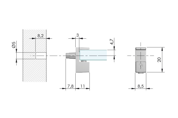 Elegantní policová podpěra pro skleněné police 8 mm, s pinem. Jednoduchá montáž i demontáž. Plast + nikl. Vrtání otvoru - 5 mm. Povrchová úprava - nikl.