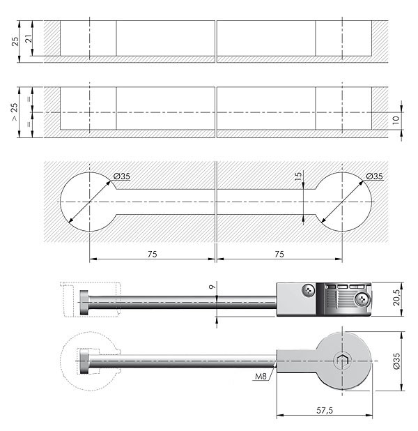 Min.tloušťka prac.desky - 25mm. Rozteč (střed, průměr 35mm) 2x75 -+ 0,3mm (150mm) drážka šířka 15mm, zahloubení 21mm.