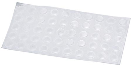 Plastikové samolepící čočky, snižující hluk při zavírání dvířek.Výška 1,6mm, průměr 8mm 1 ks zahrnuje arch 50 čoček. 1 krabice=200 archů. Barva - transparentní.