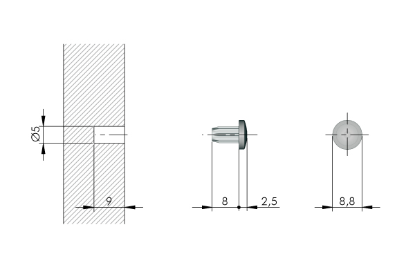 Dvojitým vstřikováním vzniká celistvý tlumič ze dvou různých materiálůtuhý čep, který umožňuje rychlou instalaci pomocí předvrtaného otvoru průměru 5 mm.