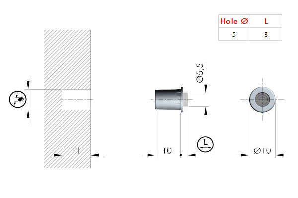 Závrtný tlumič se silikonovou vrstvou pro kvalitní utlumení. Pro otvor 5 mm, zahloubení 11 mm. Venkovní rozměr 10 mm, přesah 3 mm.