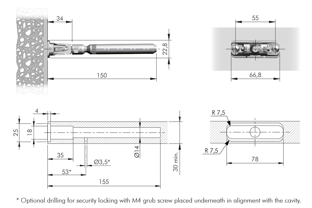 Nosnost páru při hloubce police 300mm = 30kg. Umožňuje třístranné seřízení - vertikáln, boční a seřízení sklonu.Montáž do stěny pomocí 2 hmoždinek pr.8 mm a 2 šrouby, rozteč vrtání 55 mm.Průměr trnu 14 mm, délka trnu 116 mm,celková délka 150 mm. Minimální tloušťka police 25mm. V případě použití police o tloušťce 25 -30mm zůstává nezafrézován "límec" držáku - 4mm. V případě použití police 30mm a více, je možné zafrézovat i tento "límec". VELMI DŮLEŽITÉ. Držáky musí být vždy montovány nápisem "TOP-ALTO" nahoru. Pro snadnější montáž je možno objednat kompletní sadu vrtacíc přípravků - 405882 IF-kompletní sada vrtácích přípravků pro Triade Mini, Triade a Triade Maxi.