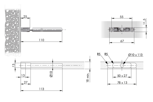 Nosnost páru při hloubce police 200mm = 15kg. Umožňuje třístranné seřízení-vertikální,boční a seřízení sklonu. Montáž do stěny pomocí 2 hmoždinek pr.6mm a 2 šroubů velikosti 4,5m, rozteč vrtání 55mm. Průměr trnu 10mm, délka trnu 85mm,celková délka 110mm. Minimální tloušťka police 18 mm. VELMI DŮLEŽITÉ. Držáky musí být vždy montovány nápisem "TOP-ALTO" nahoru.