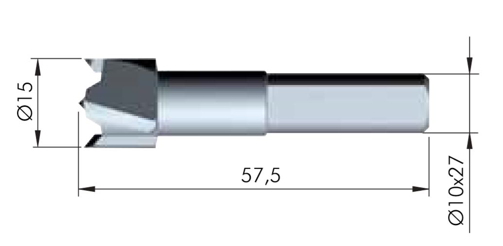 Vrták pro zhotovení zahloubení policové podpěry Flipper. Průměr 15 mm, délka 57,5 mm.