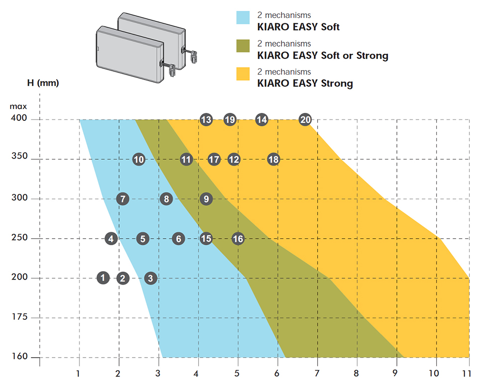 Systém Kiaro Easy je symetrický a umožňuje pravolevou montáž pouhým překlopením mechanismu. Dynamiku tlumení (nastavení síly) při otevírání lze snadno seřídit pomocí šroubu na tělese. Standardní úhel otevření 90° lze jednoduše nastavit pomocí imbusového klíče v rozmezí -13° (nahoru) až +7° (dolů). Nastavení úhlu otevření je nutno provést před nastavením síly.