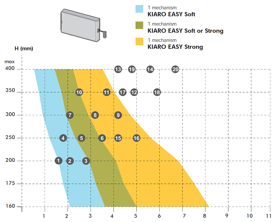 Systém Kiaro Easy je symetrický a umožňuje pravolevou montáž pouhým překlopením mechanismu. Dynamiku tlumení (nastavení síly) při otevírání lze snadno seřídit pomocí šroubu na tělese. Standardní úhel otevření 90° lze jednoduše nastavit pomocí imbusového klíče v rozmezí -13° (nahoru) až +7° (dolů). Nastavení úhlu otevření je nutno provést před nastavením síly.