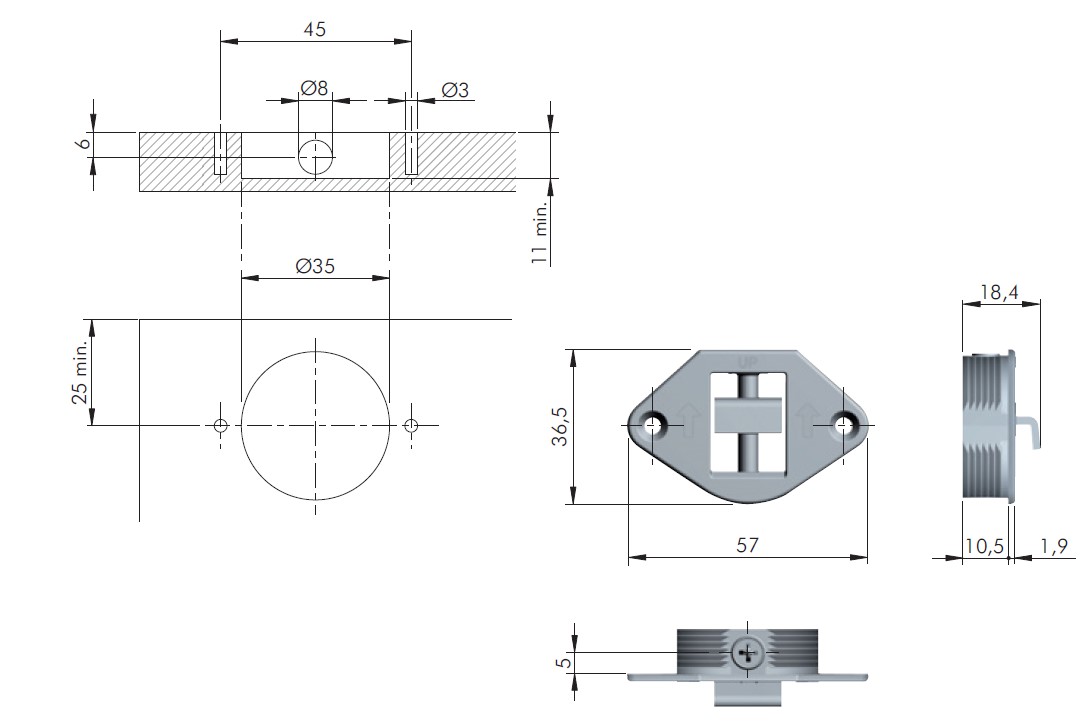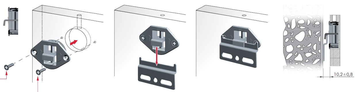 Kování pro zavěšení desek a panelů (zrcadlo, obklad) na stěnu. Kování se zavrtá do zad (vrtání pr.35mm). Jako protikus slouží závěsná liště na stěnu, např. 352537, nebo 389592 závěsný plech na stěnu s dorazy Š=60mm