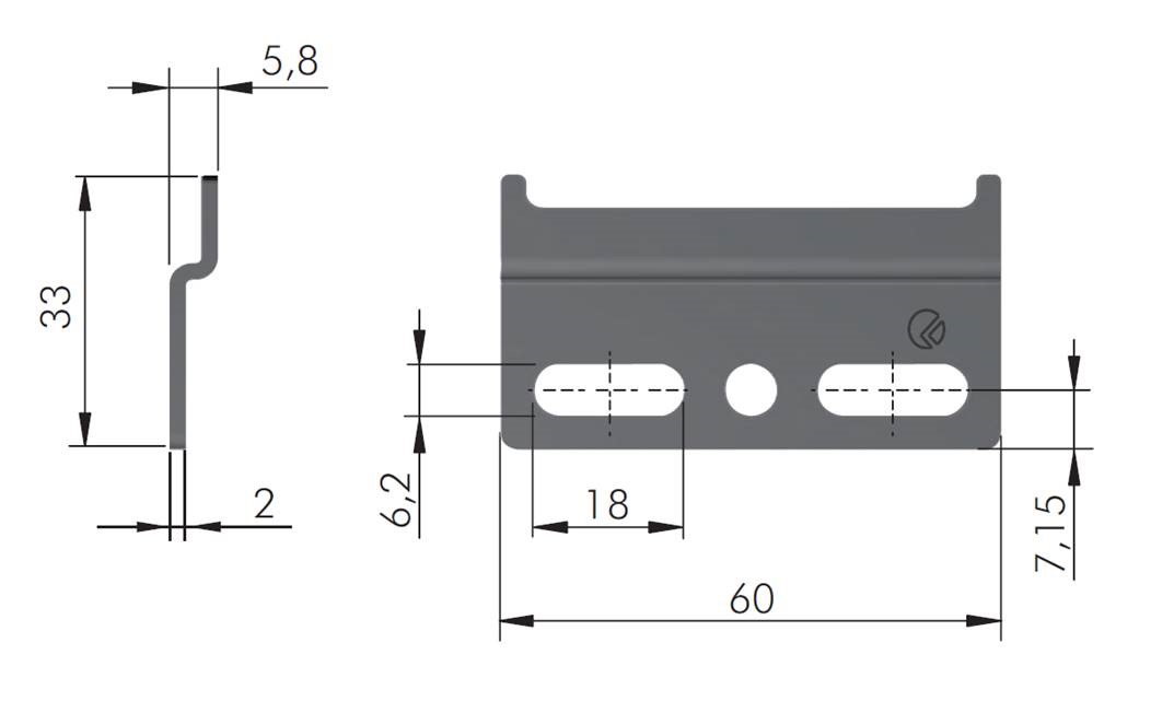 Závěsný plech pro závěsná kování. Dorazy proti bočnímu sklouznutí závěsného kování. Rozměry Š = 60mm, V= 33mm, H = 5,8mm, toušťka plechu 2mm. Materiál pozinkovaný plech.