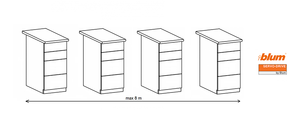 Sada ServoDrive pro 4 korpusy/16 zásuvek/max. výšky korpusu 1170mm. Maximální vzdálenost krajních korpusů mezi sebou 8m. Sada obsahuje veškeré potřebné SERVO-DRIVE komponenty pro sestavení funkčního elektricky bezúchytkově otvíraného nábytku (použitelné pro Antaro, Legrabox, Tandem a Movento). Výsuvy pro kombinaci se SERVO-DRIVE použijte tlumené.