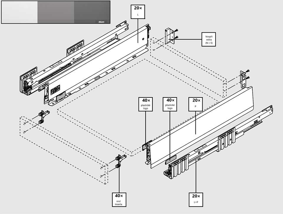 Nutno dokoupit držáky zad M nebo E podle požadavku na výšku šuplíku a v případě výšky E také nástavby bočnice - čelní uchycení nahoře (trn), podélný reling, plný boxcap nebo prosklený boxcover.