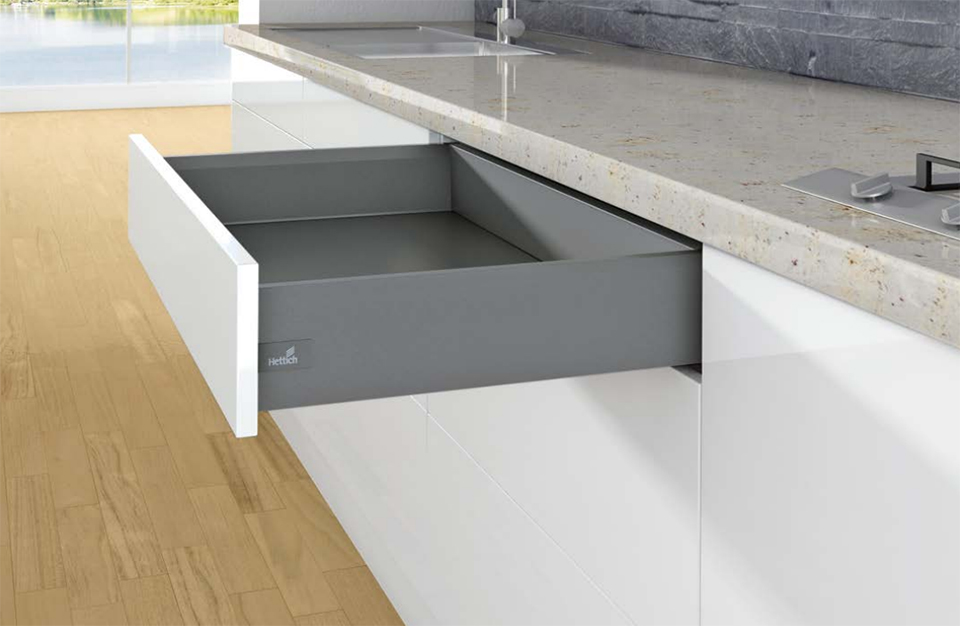Kování pro čelní zásuvku ArciTech v barvě antracit, hloubka výsuvů 650mm, výška bočnice 126mm, nosnost výsuvů 60kg, tlumení SiSy. Sada obsahuje 1 pár bočnic, 2ks čelního kování (hmoždínka), 2ks krytky Hettich, 2ks držáky zad. Pro bezúchytkvé otevírání P2OS je nutno dopnit o správný modul P2O, v případě, že je zásuvka širší než 600mm je zapotřebí přidat synchronizační tyč (318279) krácení= vnitřní šířka korpusu-2xEB-207.