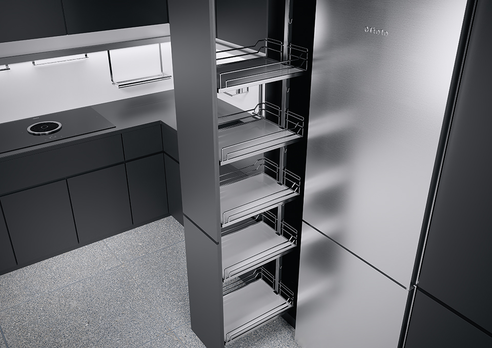 ... je produkt, který díky individuálně zavěšeným a výškově nastavitelným policím zajistí dostatek optimálně využitého prostoru na minimální zastavěné ploše. Celou výšku a šířku skříně lze plně využít. Vytváří se tak prostor, pořádek a přehled zároveň - a to nejen v kuchyni. Dokonce i na horních policích je vždy vše na očích - a to z obou stran!