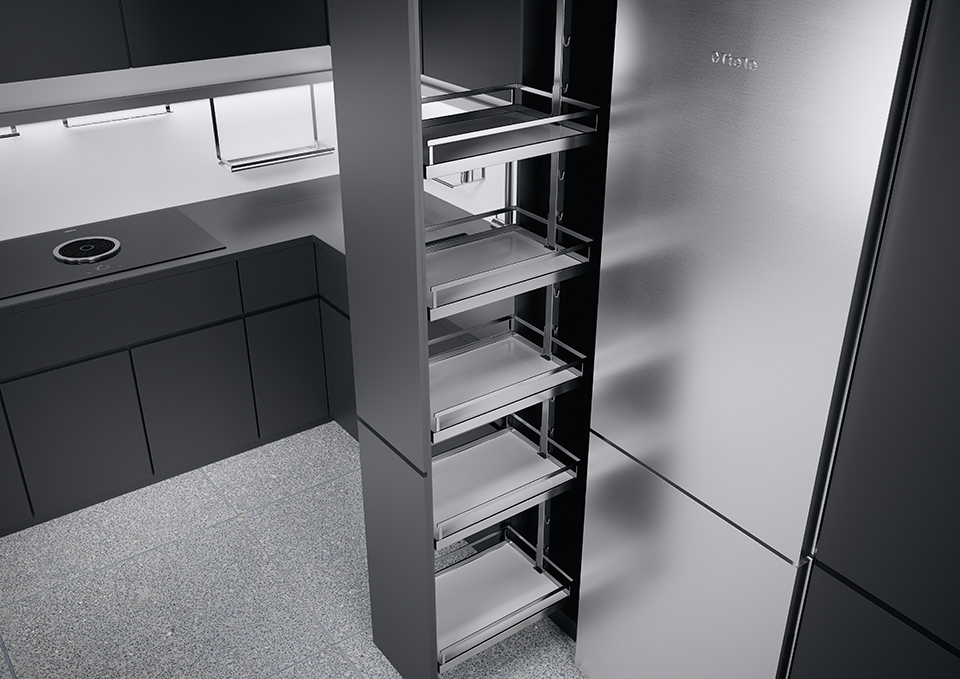 ... je produkt, který díky individuálně zavěšeným a výškově nastavitelným policím zajistí dostatek optimálně využitého prostoru na minimální zastavěné ploše. Celou výšku a šířku skříně lze plně využít. Vytváří se tak prostor, pořádek a přehled zároveň - a to nejen v kuchyni. Dokonce i na horních policích je vždy vše na očích - a to z obou stran!