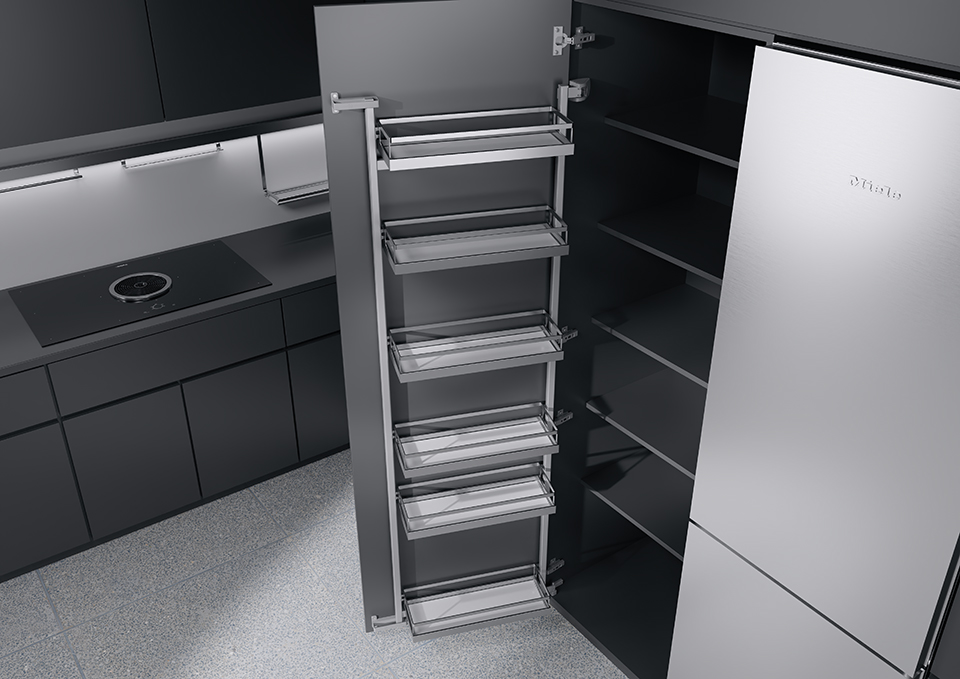 Kompletní sada kování pro výrobu potravinové skříně Tandem Side III - část na dveře. S koši ve variantě Arena Style - bílé dno, reling chrom. Pro korpusovou šířku 600mm a světlou výšku 1700mm.