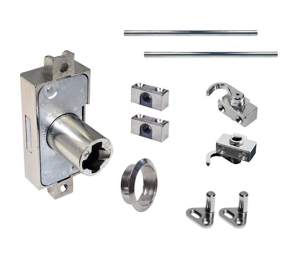 obsahuje 1 ks zámku, 1 ks rozeta, 2ks tyč (1000 mm), 1 ks horní háček, 1 ks dolní háček, 2 ks vodítka, 2 ks kolíček