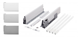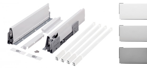 Výsuv s tlumením a dutou bočnicí včetně 2 párů relingů. Délka 270mm, výška 204(225mm). Nosnost do 35kg. Barva šedo-stříbrná (titan). Vše potřebné pro sestavení čelní zásuvky v této sadě. Pro vnitřní zásuvku je nutno doobjednat čelní panel.