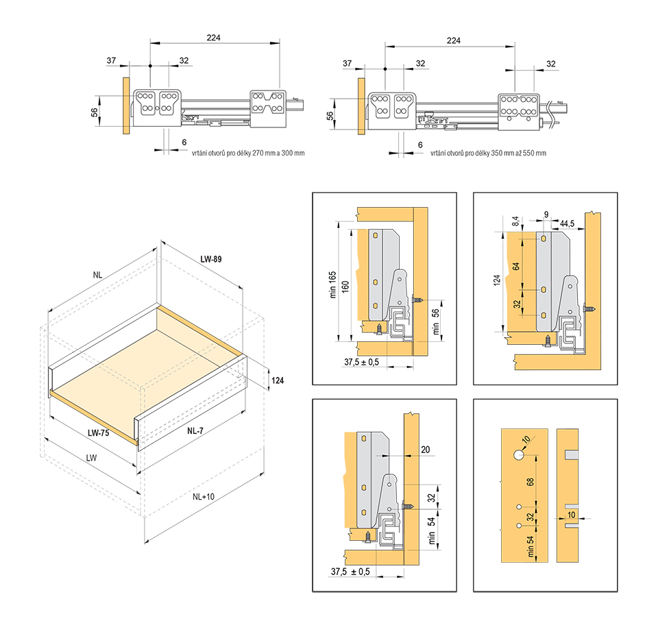 Výsuv s tlumením a dutou bočnicí včetně 1 páru hranatých relingů. Délka 270mm, výška 140 (165mm). Nosnost do 35kg. Barva šedá. Vše potřebné pro sestavení čelní zásuvky v této sadě. Pro vnitřní zásuvku je nutno doobjednat čelní panel.