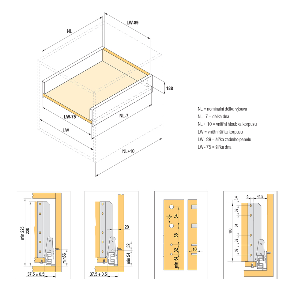 Výsuv s tlumením a dutou bočnicí včetně 2 párů hranatých relingů. Délka 450mm, výška 204 (225mm). Nosnost do 35kg. Barva šedá. Vše potřebné pro sestavení čelní zásuvky v této sadě. Pro vnitřní zásuvku je nutno doobjednat čelní panel.