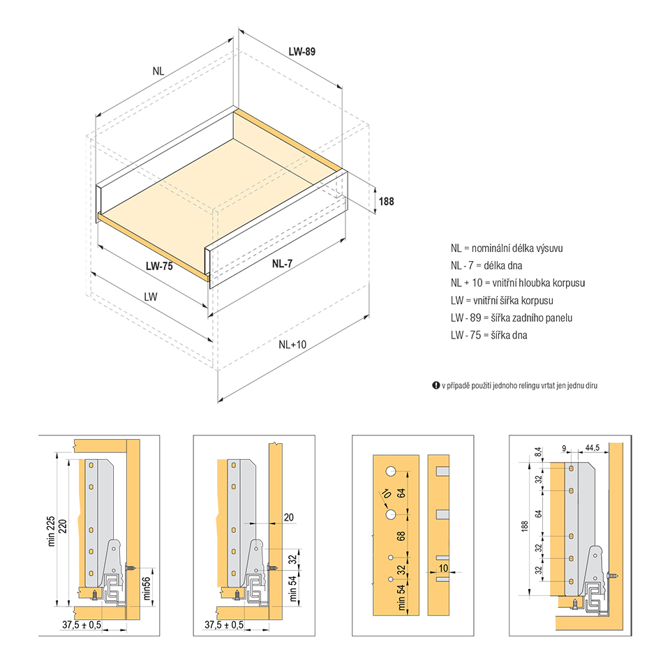 Výsuv s tlumením a dutou bočnicí včetně 1 páru hranatých relingů. Délka 550mm, výška 204 (225mm). Nosnost do 35kg. Barva šedá. Vše potřebné pro sestavení čelní zásuvky v této sadě. Pro vnitřní zásuvku je nutno doobjednat čelní panel.