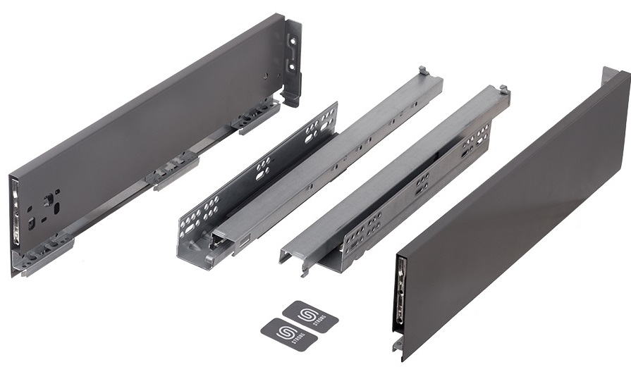 Kompletní sada pro výrobu zásuvky s úzkou (13mm) dutou bočnicí a výsuvy s tlumeným dotahem a vnitřní synchronizací. Nosnost do 40kg. Životnost výsuvů minimálně 50.000 cyklů. Seřízení čela nahoru/dolů a doprava/doleva. Možnost seřízení náklonu celé zásuvky v zadní části bočnice (slouží k seřízení náklonu čela). Pro výrobu dna a zad nutno použít materiál tloušťky 16mm.