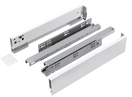 Kompletní sada pro výrobu zásuvky s úzkou (13mm) dutou bočnicí a výsuvy s tlumeným dotahem a vnitřní synchronizací. Nosnost do 40kg. Životnost výsuvů minimálně 50.000 cyklů. Seřízení čela nahoru/dolů a doprava/doleva. Možnost seřízení náklonu celé zásuvky v zadní části bočnice (slouží k seřízení náklonu čela). Pro výrobu dna a zad nutno použít materiál tloušťky 16mm.