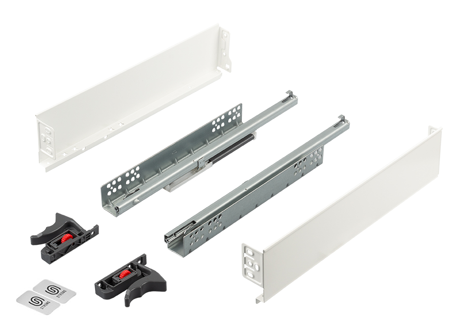 Kompletní kování pro sestavení ekonomické boxové zásuvky s extrémně tenkou kovovou bočnicí (single-wall) tloušťky 1mm a skrytými tlumenými výsuvy. Kromě čela nutno doplnit ještě přířezy dna a zad (stejná šířka), možno použít materiál tloušťky 16mm i 18mm.