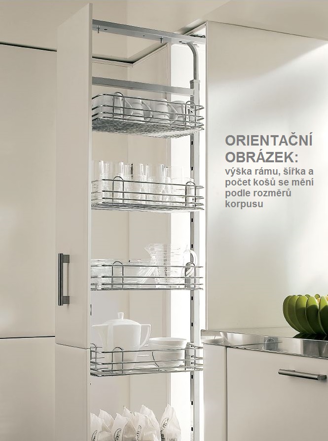 Potravinová skříň pro korpus o vnitřní výšce 1760-2080, vnější šíři 300mm. Včetně 6-ti košů. Kuličkový celovýsuv s tlumením.