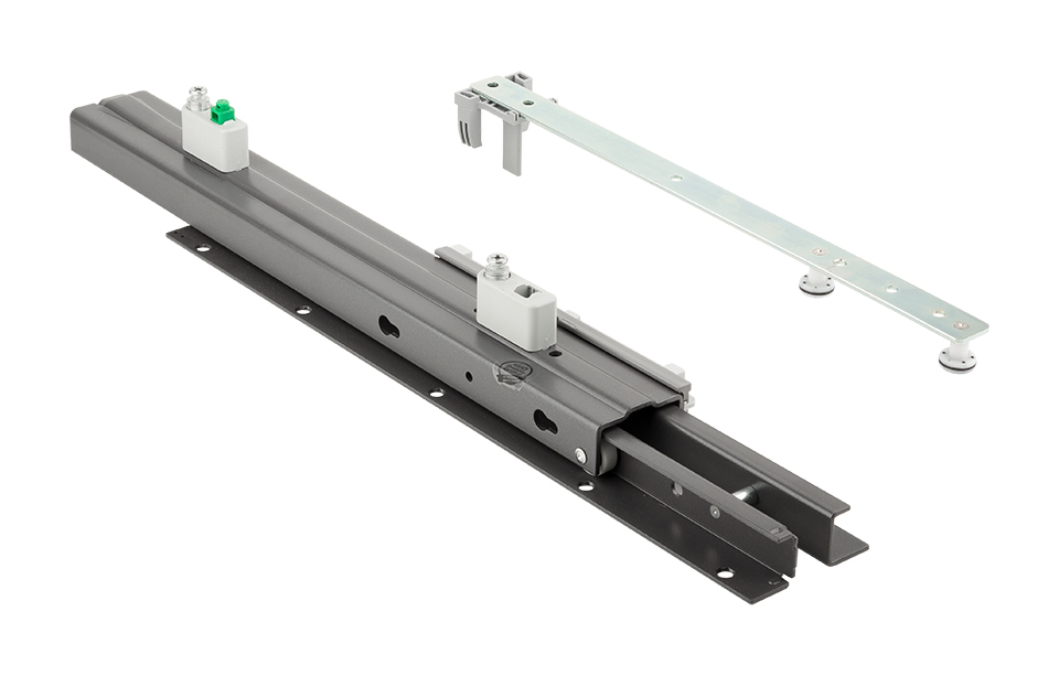 Částečný výsuv s tlumením pro potravinovou skříň DISPENSA, nosnost max.100kg. Pouze pro korpus 150 mm. Hloubka 500 mm. Výška 43 mm.