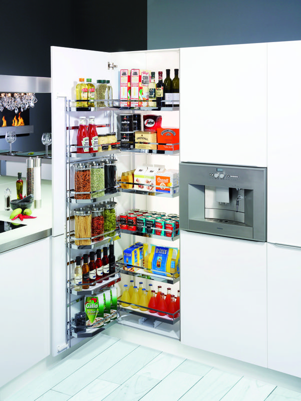 Kompletní potravinová skříň Tandem včetně výsuvu, rámu a sady 6 košů vnitřních i na dvířka. Design: Arena CLASSIC dno s Anti-slip nesmekovou povrchovou úpravou, klasický drát. Pro vnitřní výšku korpusu od 1700mm a šířku 500 (min.462)mm. Rozměry vnitřních košů: šířka: 433, hloubka: 275, výška: 88mm. Úhel otebření max. 110°. Nosnost vnitřní police 8,5kg, vnější 3,5kg. Celková nosnost této varianty 70kg.