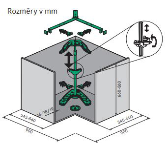 Mechanismus pro řešení spodní rohové skříňky (3/4) REVO 90 s dveřmi pevně s mechanismem spojenými. Dveře se otáčí společně s policemi a ve chvíli kdy se dostanou do prostoru vstupního otvoru se automaticky zavřou (s tlumením). Vnitřní rozměry korpusu: šířka: 750(800)/850(900), hloubka 750(800)/850(900), výška 660-860mm. Police: Arena STYLE: 800 - 135890, 900 - 135891, Arena CLASSIC: 800 - 135923, 900 - 135924, celodrátěné: 800 - 135892, 900 - 135893. Sada obsahuje: přední uchycení 4 ks, středová osa 1 ks, posuvný nosič polic 1 ks, horní upevňovací rám 1 ks