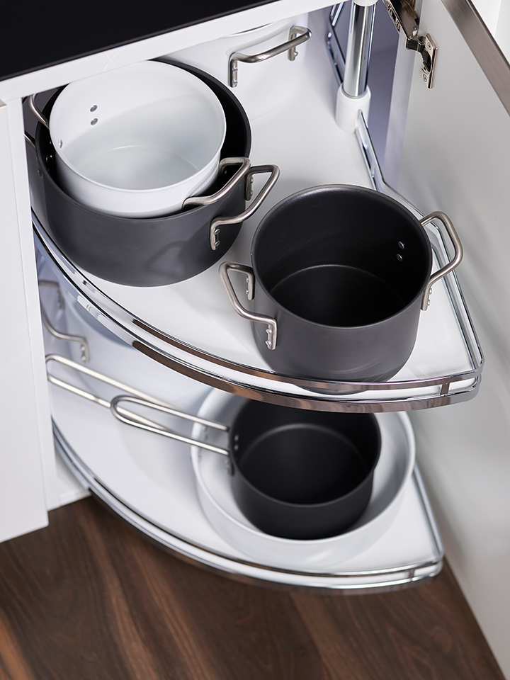 Určeno pro spodní rohový korpus o šířce 900mm (1/2). Sada dvou kusů polic Arena Style, dno s Anti-slip, nesmekovou povrchovou úpravou. Určeno pro korpusy s klasicky otvíranými dvířky na závěsech. Vnitřní rozměry korpusu: šířka-větší nebo rovno 840mm, hloubka-větší nebo rovno 475 mm, výška 655-745mm. Průměr police: 750 mmTeleskopickou tyč nutno objednat zvlášť pod kódem 353254.
