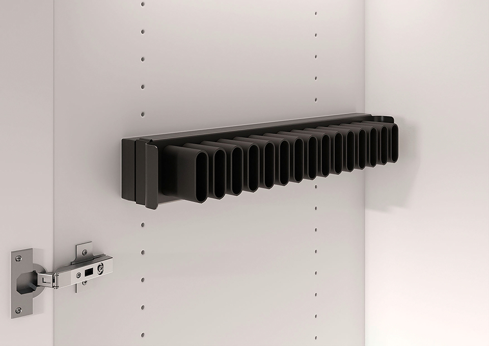 Výsuvný věšák na kravaty a opasky. Má měkký povrch pro šetrné ukládání opasků, kravat a šátků. Vhodně doplní volný prostor pod věšákem na oblečení. Čistý výsuv bez rizika znečištění oděvů.