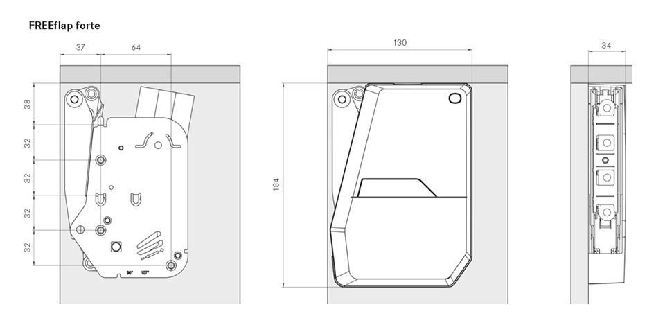 Pro bezúchytkové otevírání je kromě elektrického systému eTouch možno využít také PTO pístky, výběr a dimenzování viz související dokumenty. Dvířko se po namáčknutí pootevře na délku pístku a poté je možno jej uchopit rukou a otevřít do požadované polohy.