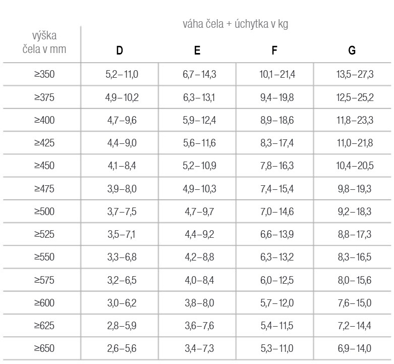 Pro výšku čela 350mm a váhu 13,5 - 27,3kg. Pro výšku čela 375mm a váhu 12,5 - 25,2kg. Pro výšku čela 400mm a váhu 11,8 - 23,3kg. Pro výšku čela 425mm a váhu 11,0 - 21,8kg. Pro výšku čela 450mm a váhu 10,4 - 20,5kg. Pro výšku čela 475mm a váhu 9,8 - 19,3kg. Pro výšku čela 500mm a váhu 9,2 - 18,3kg. Pro výšku čela 525mm a váhu 8,8 - 17,3kg. Pro výšku čela 550mm a váhu 8,3 - 16,5kg. Pro výšku čela 575mm a váhu 8,0 - 15,6kg. Pro výšku čela 600mm a váhu 7,6 - 15,0kg. Pro výšku čela 625mm a váhu 7,2 - 14,4kg. Pro výšku čela 650mm a váhu 6,9 - 14,0kg.